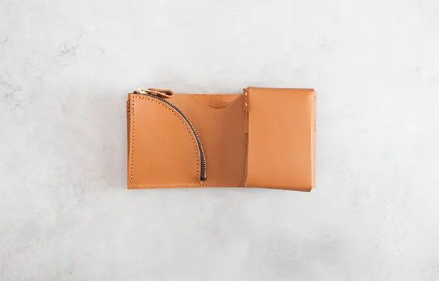 カードポケットの左右を縫わず、一方では革を内側へ折り返して固定し、もう一方では折り返した後の側面に縫い代をずらしています。両側の縫い代がなくなり収納の邪魔をすることがなくなりました。外寸を小さくしても、余裕のある内部空間を確保しました。お札の幅ギリギリではなくある程度余裕のある大きさにしていますので、収納しやすくなっています。